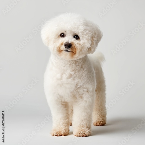 © Aleksandr S, Fototapeta premium A Bichon Frise stands proudly in a show stack pose, its cloud-like white coat highlighted by expert lighting, creating a striking contrast with tiny black eyes and nose
