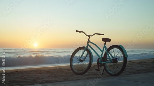 Fototapeta premium A bicycle is parked on the beach at sunset