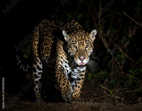 © Bakar, Obraz premium A big cat with spots emerges from dark foliage