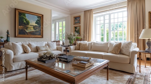 © Elmin, Fototapeta premium A big, comfy cream-colored sofa sits in the roomy living room.