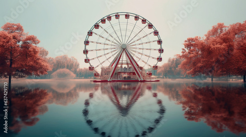 © Avalga, Fototapeta premium a big ferris wheel with trees and a lake, in the style of white and red
