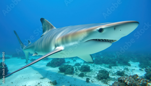 © paulmalaianu, Obraz premium A big shark swims underwater.