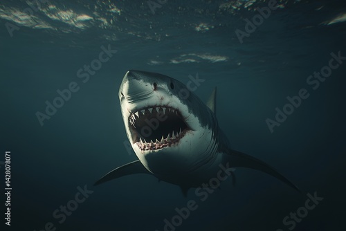 © Georgy, Naklejka premium A big white shark with open teeth is a dangerous marine predator in the tropical ocean reef nature
