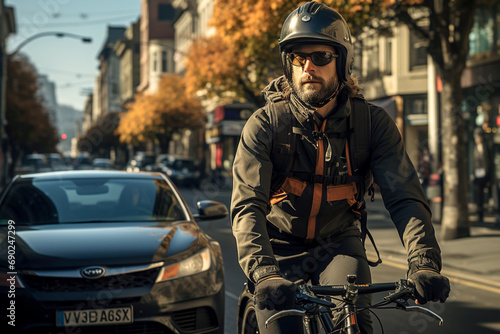 © Aydan, Fototapeta premium A bike courier in the middle of traffic delivering parcels