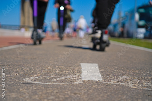 © Aleksandr, Fototapeta premium A bike path with markings and scooters passing along it. Scooters on the bike path. Rest on a scooter in the city center. Sports leisure.