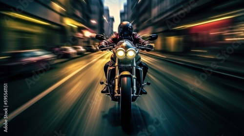 © Neuroshock, Obraz premium A biker on a motocycle in a night city, motion blur, slow shutter camera speed created with generative AI technology