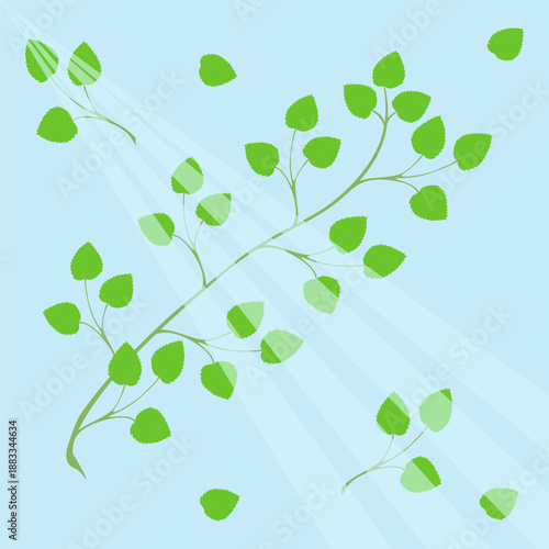 © Sofya, Obraz premium A birch branch in spring with fresh green leaves on a blue background with sun rays