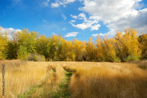 © David, Fototapeta premium A birch forest with yellow leaves along a creek in the autumn, or fall.