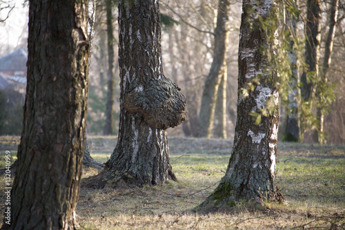 Naklejka premium A birch tree with a large burl stands out in a tranquil woodland on a sunny day.