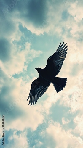© V.Semeniuk, Obraz premium A Bird in Flight Against a Backdrop of Wispy Clouds During the Golden Hour