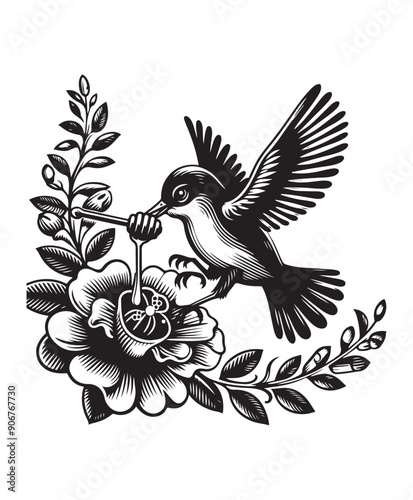 © Graphic_Design, Obraz premium A bird in flight eating honey from a flower vector style, black and white color