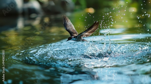 © Mikus, Fototapeta premium A bird in flight over a body of water, leaves a splash at its wake