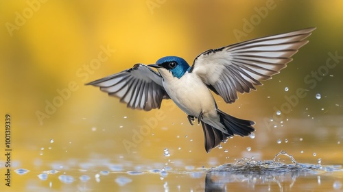 © arsya, Naklejka premium A bird in mid-flight above water, creating splashes as it hunts for insects.