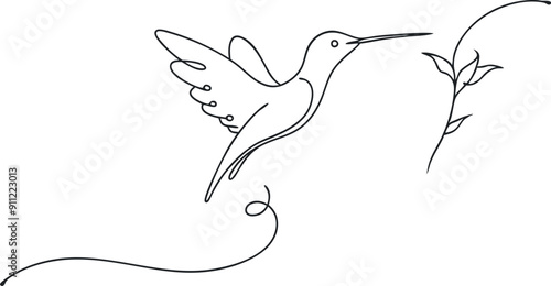 © Designfly, Fototapeta premium A bird is flying in the air with its beak open. The bird is surrounded by a leafy green background