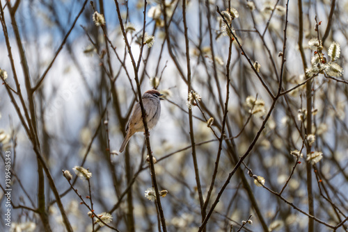 © Jakob, Obraz premium A bird is perched on a branch of a tree. The bird is brown and white. The tree is full of blossoms
