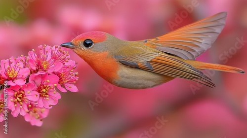© imagineRbc, Obraz premium A bird is perched on a pink flower. The bird is orange and black
