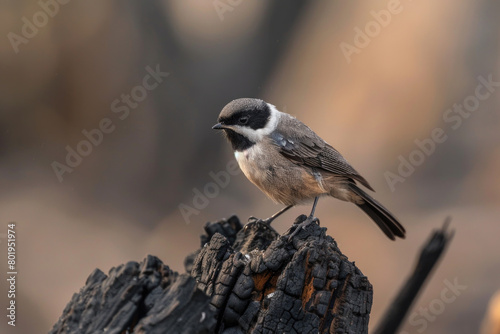 Naklejka premium A bird perched on a charred tree stump in a forest that has been burned,...