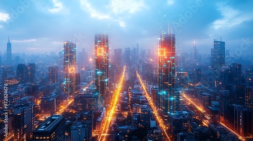 © TranNgoc, Fototapeta premium A bird's-eye view of a futuristic city controlled by artificial intelligence, where glowing neon data circuits run through every building and street.