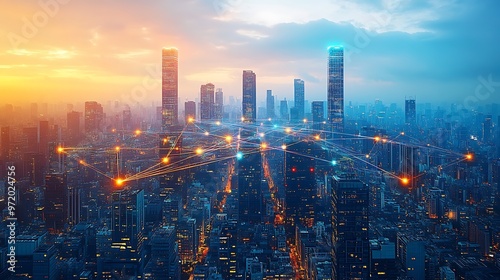 © TranNgoc, Obraz premium A bird’s-eye view of a futuristic cityscape at twilight, where towering high-rises are connected by glowing communication lines symbolizing cloud networks.