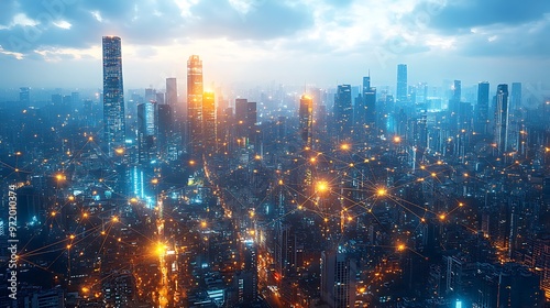 © TranNgoc, Obraz premium A bird’s-eye view of a futuristic metropolis, with glowing data lines crisscrossing between high-rise buildings, public spaces, and transportation hubs.