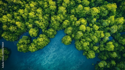 © creative, Naklejka premium A bird's-eye view of a lush green mangrove forest surrounding a calm, teal-colored body of water.