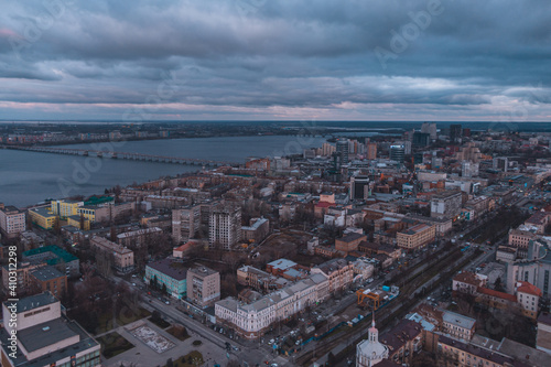© Denis Chubchenko, Obraz premium A bird's eye view of the dark blue sky over the city. Gloomy city