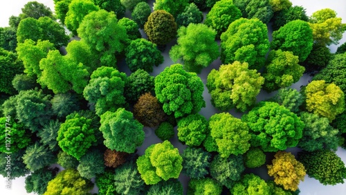 Naklejka premium A bird's-eye view reveals a vibrant green tree canopy, isolated leaves detail...
