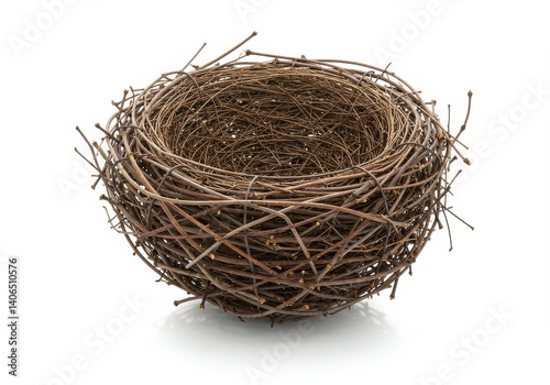 © Laki, Obraz premium A bird's nest made of twigs and branches is isolated on a white background in a studio shot