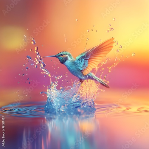 © Arabindu, Fototapeta premium A bird sits gracefully atop a dynamic splash of colorful water image