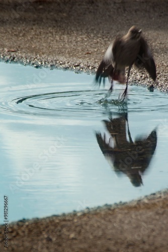 Fototapeta premium A bird splashes in a puddle, creating ripples and reflections in the water.
