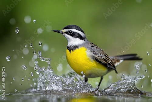© Fotograf, Fototapeta premium A bird splashes water on a rock, creating ripples
