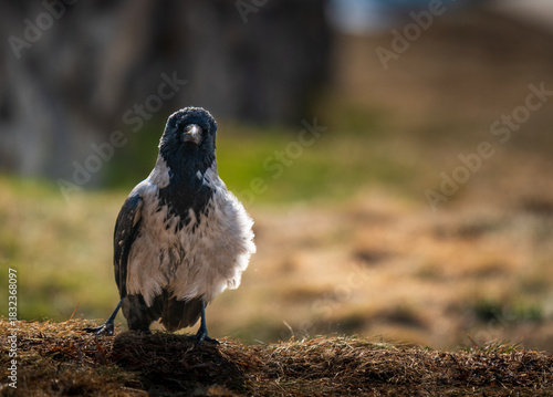 Naklejka premium A bird with a black beak stands on a grassy hillside