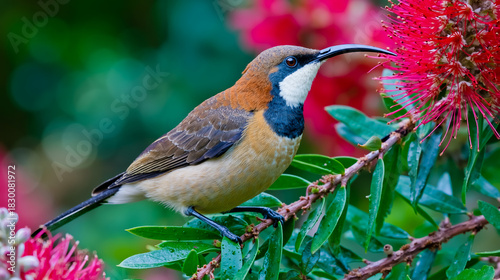 © Nikname, Fototapeta premium A bird with a blue head and a brown body is perched on a branch with pink flowers