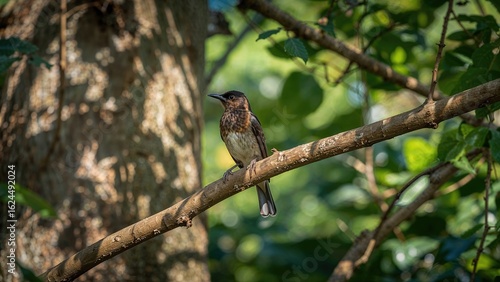 © The 2R Artificiality, Naklejka premium A bird with blue eyes resting on a tree branch in a lush green setting