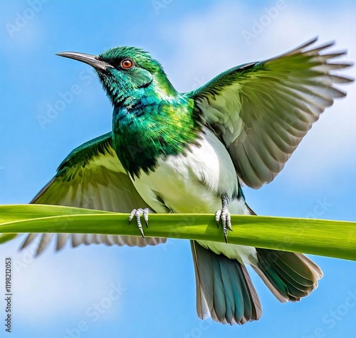 © muhammadalhasani, Obraz premium A bird with green and white feathers perched on a green plant stem. The bird appears to be spreading its wings.