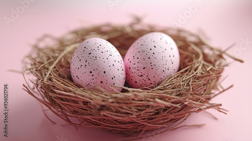 Fototapeta premium a birds nest with two speckled eggs on a pink background