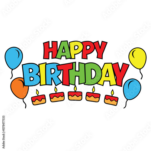 Fototapeta premium A birthday sign with a cake, candles, and balloons. The sign says Happy Birthday. The cake is on the left side of the sign, and the candles are on the right side