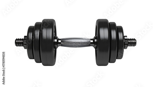 Naklejka premium A black adjustable dumbbell with weight plates, set against a solid black background in center focus