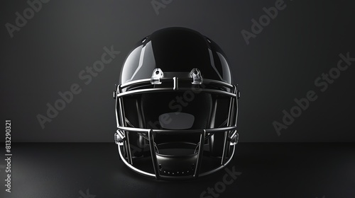 © Galib, Fototapeta premium A black American football helmet is sitting on a black table. The helmet is new and shiny. The facemask is made of metal and is painted black.