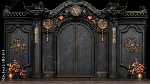 © sunchai, Obraz premium A black and gold decorated door with a red tassel hanging from it