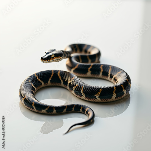 © DBA, Obraz premium A black and orange banded snake is coiled on a reflective white surface, its head slightly raised.