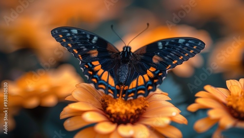 © Ashalina, Fototapeta premium A black and orange butterfly with its wings open perches on a delicate orange flower.