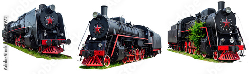 © Mostafijur, Fototapeta premium A black and red steam train with white stripes on the front, set against an isolated background