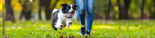 © sommersby, Fototapeta premium A black and white border collie runs towards its owner in a green park