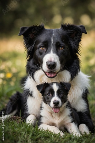 © Dannysv, Fototapeta premium A Black and White Border Collie Sitting with Two Adorable Puppies in Natural Light