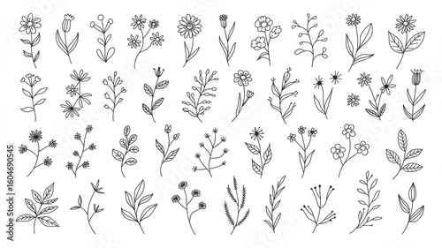 Fototapeta premium A black and white botanical illustration collection featuring 50 individual hand-drawn floral and herb sketches arranged in a grid pattern.