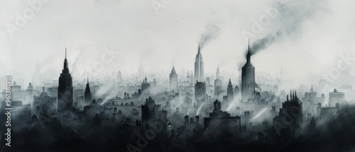 © Viktor, Fototapeta premium A black-and-white cityscape painting with smoke rising from its spires