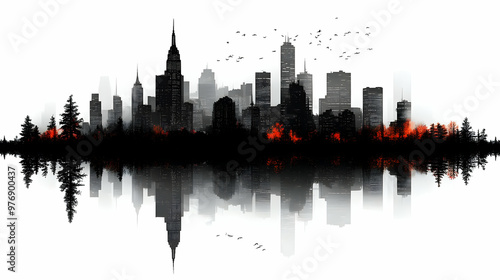 © Siasart Stock, Naklejka premium A black and white cityscape skyline with a reflection in the water. There is a forest with orange flames in front of the city.