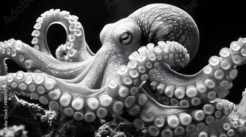 © TranNgoc, Obraz premium A black and white close-up of octopus tentacles wrapping around a coral branch, intricate detailing on the suction cups, symbolizing strength and flexibility, high contrast shading.
