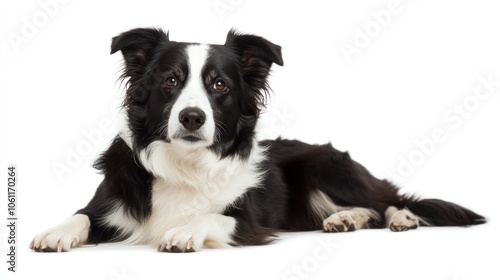 © BerkahStock, Fototapeta premium A black and white dog lying down, looking at the camera with an attentive expression.